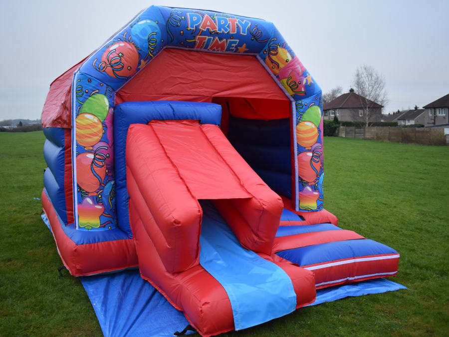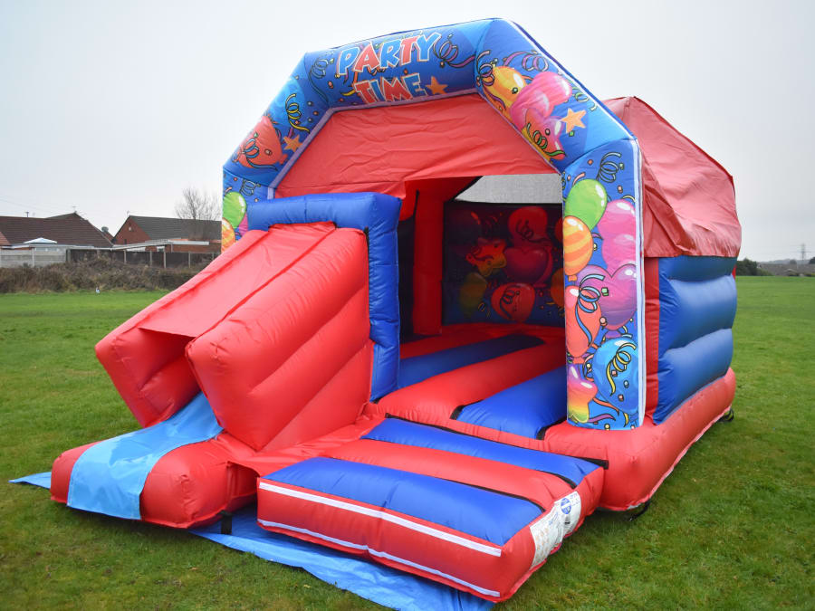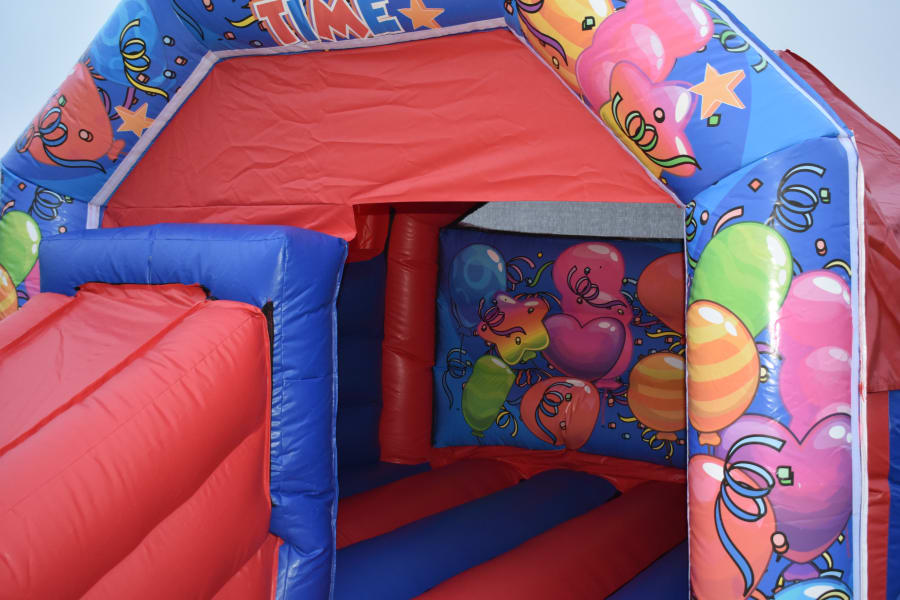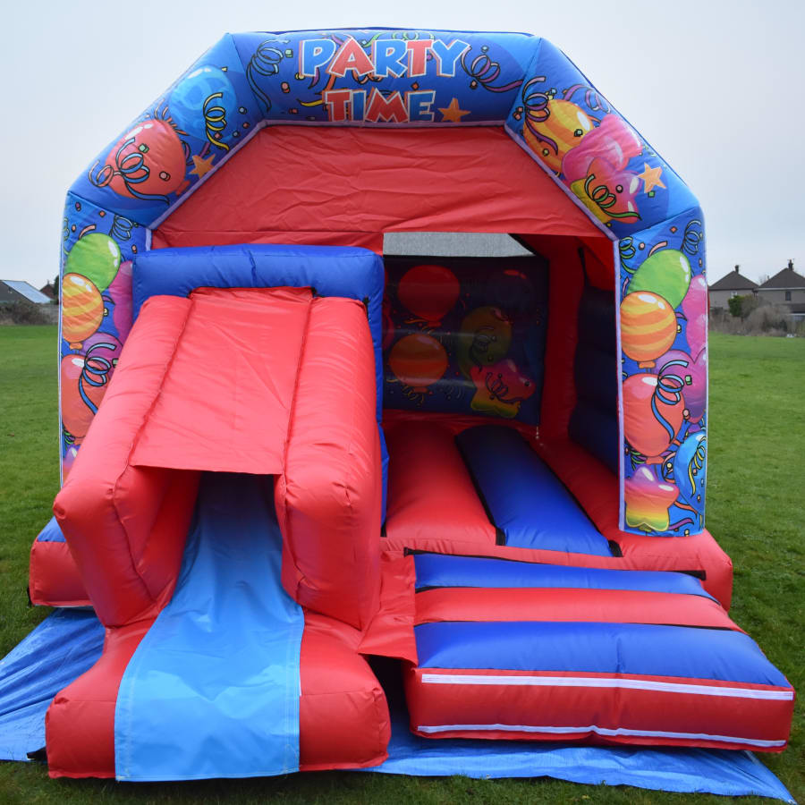 12 x 18 Blue & Red Party Time Combo Bouncy Castle Slide, this neutral unisex theme is ideal for a large variety of events and parties from BBQs to Christenings and EID celebrations even Weddings